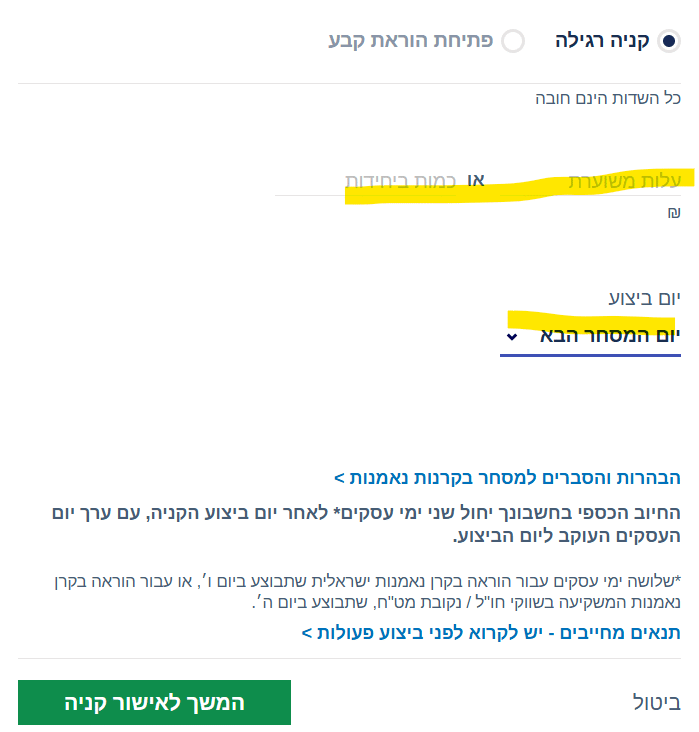 "קניה" (כפתור ירוק גדול) החלטתי כמה כסף אני רוצה לשים (עובר ישר מהחשבון בלאומי). בחרתי שיום הביצוע יהיה יום המסחר הבא כי זה היה ביום א' ואין מסחר ביום א'.